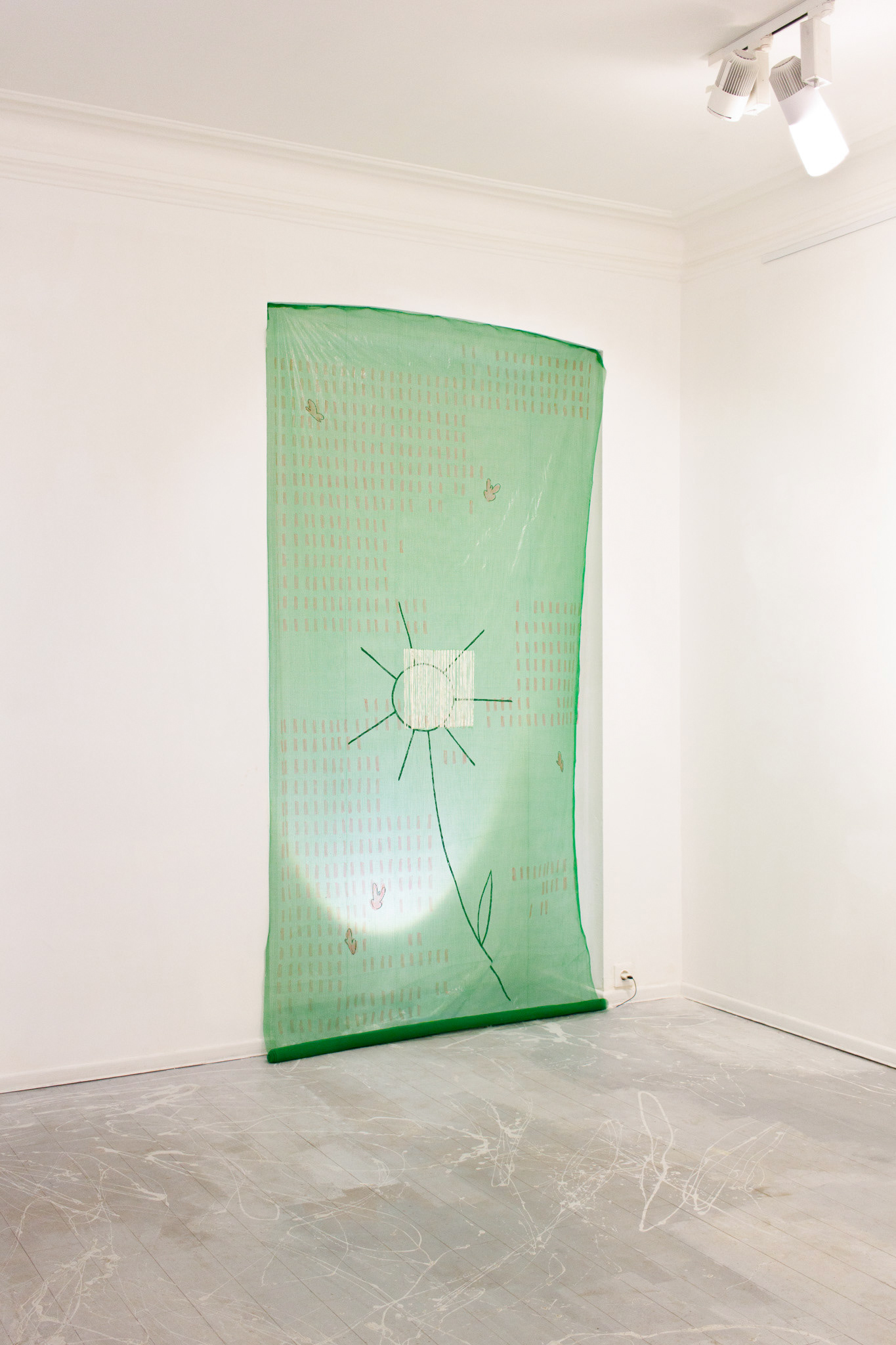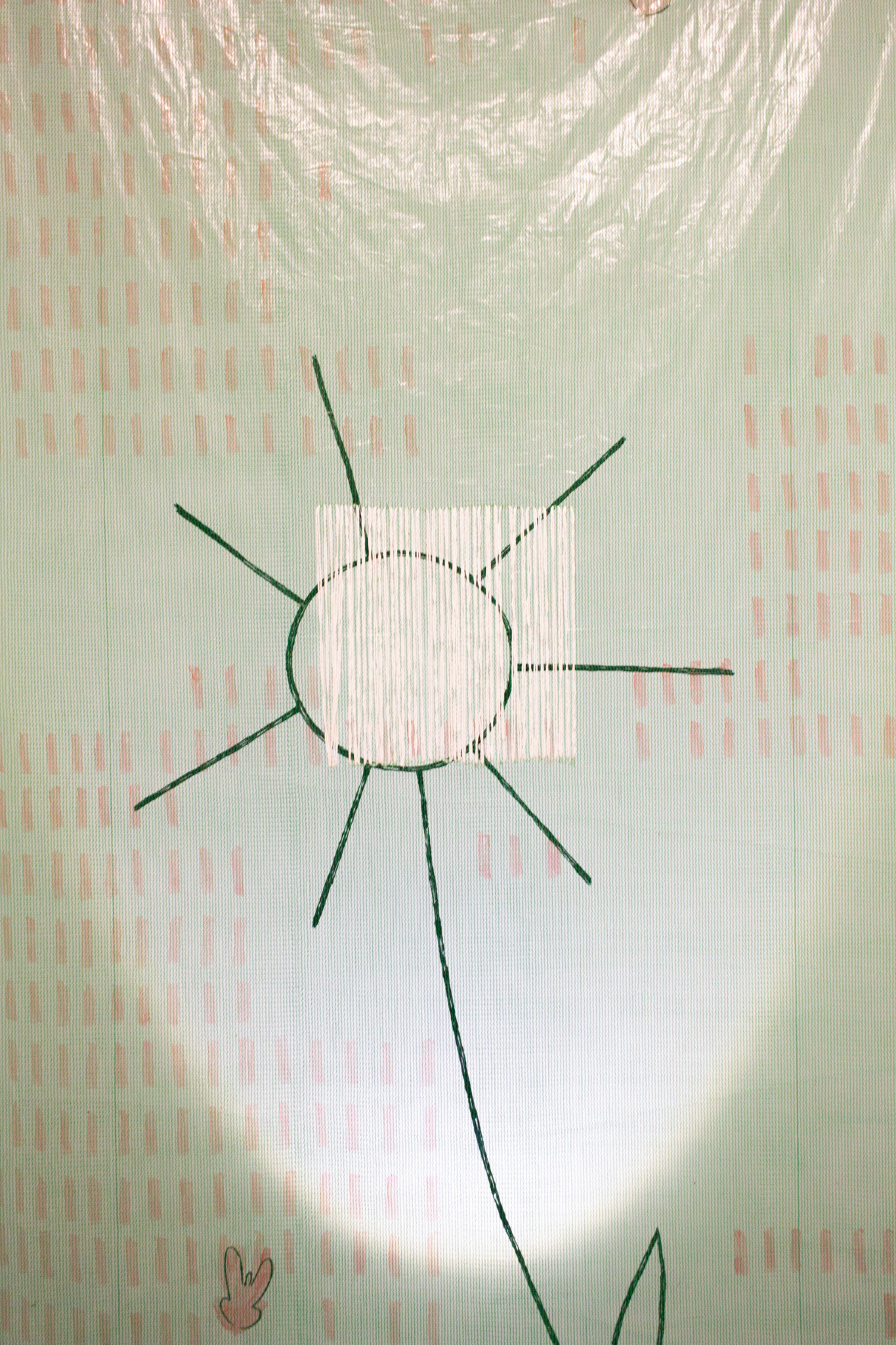 The protective construction mesh functions as a temporary boundary, a physical marker of repair, closure, and restriction. In this installation, monotonous embroidery reflecting the slow process of waiting for change and child-like drawings coexist; together they undermine the mesh’s authority, soften it, and turn it into a site of play and memory. At the same time, the mesh reflects transformation itself. There is nothing under repair in the work, only the mesh, a visible edge between the old and the new.