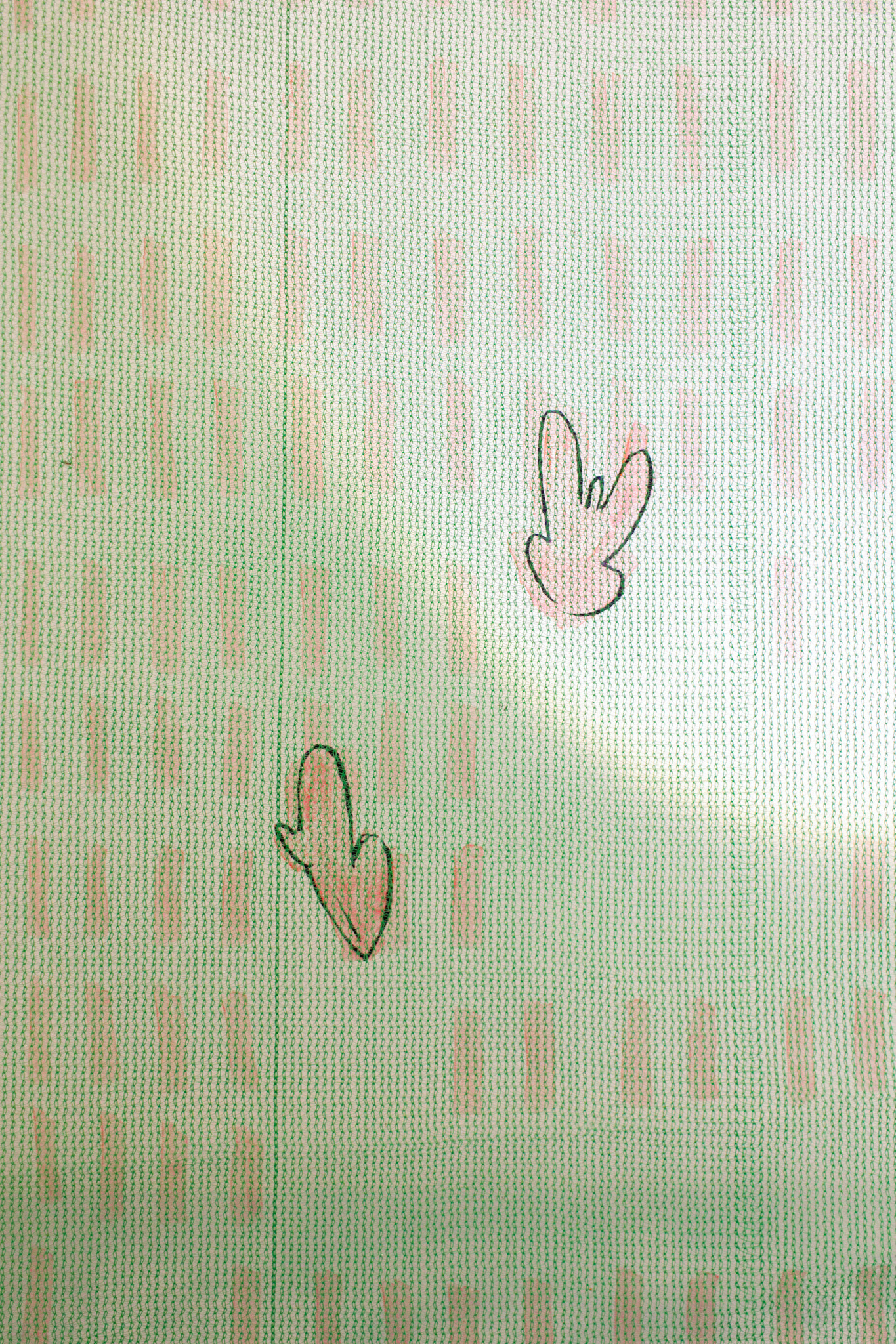 Construction safety mesh, clear protective film, cotton threads, marker drawing.