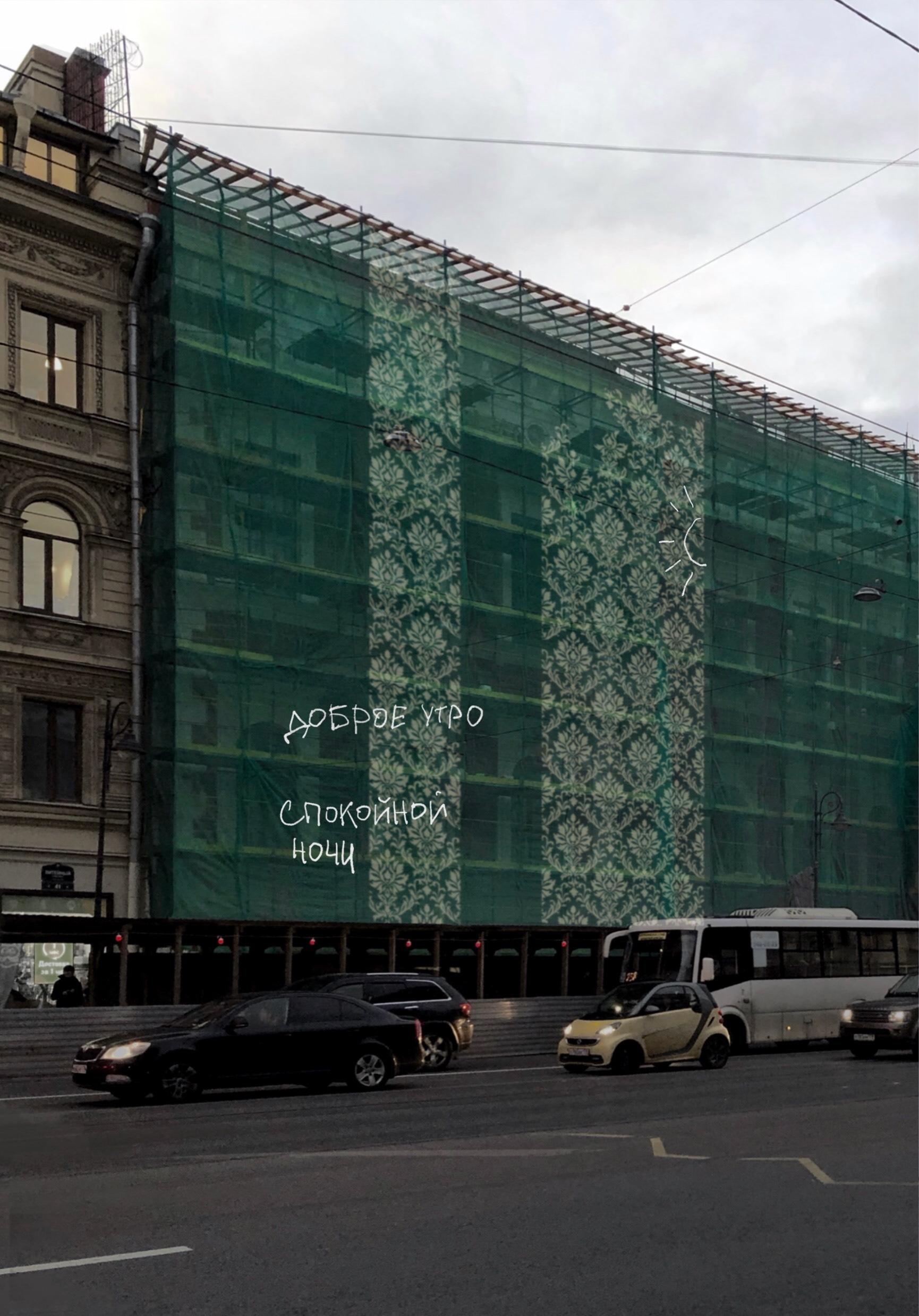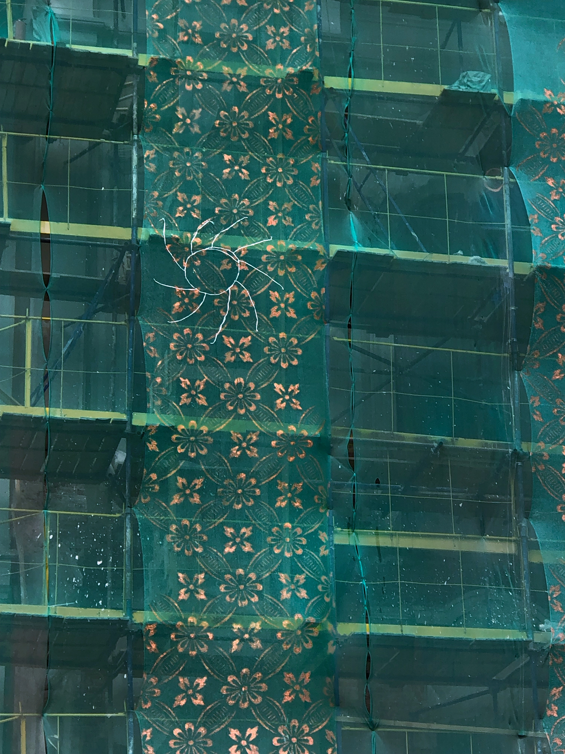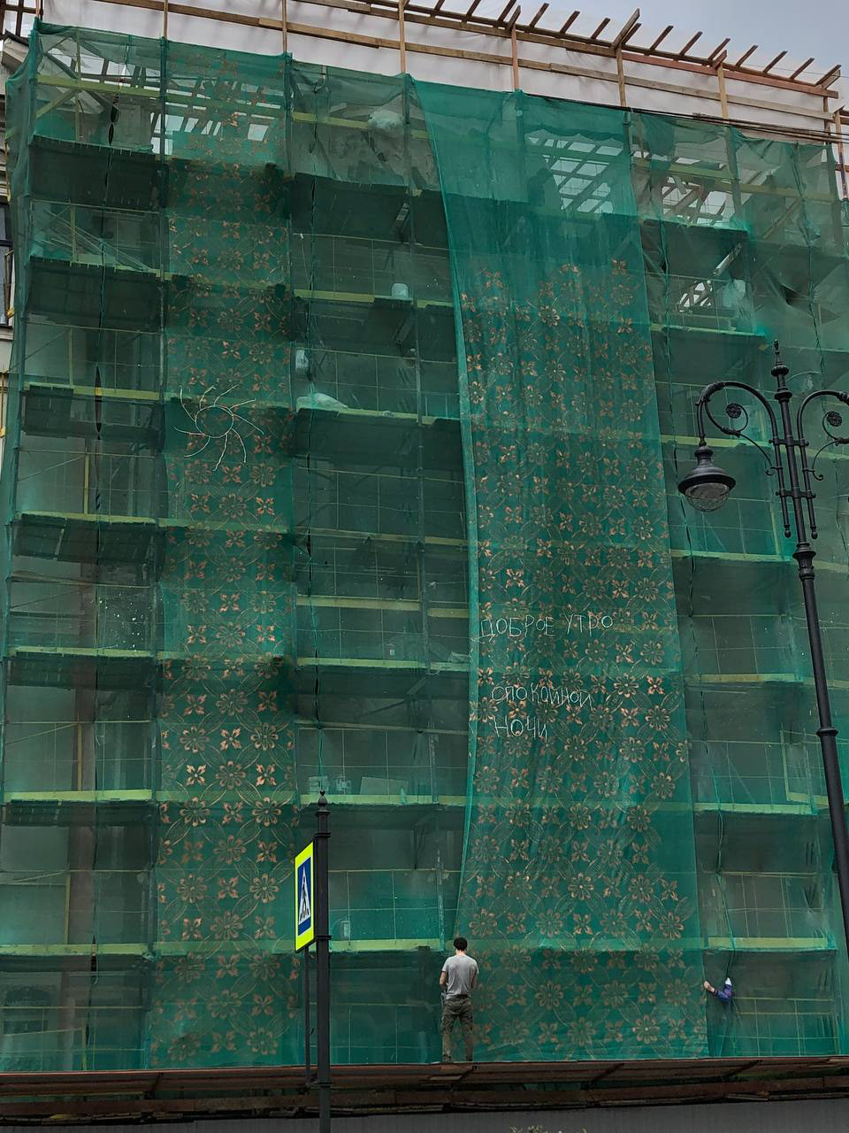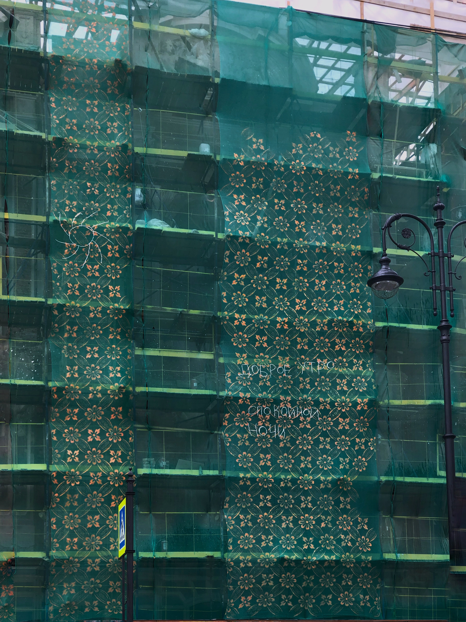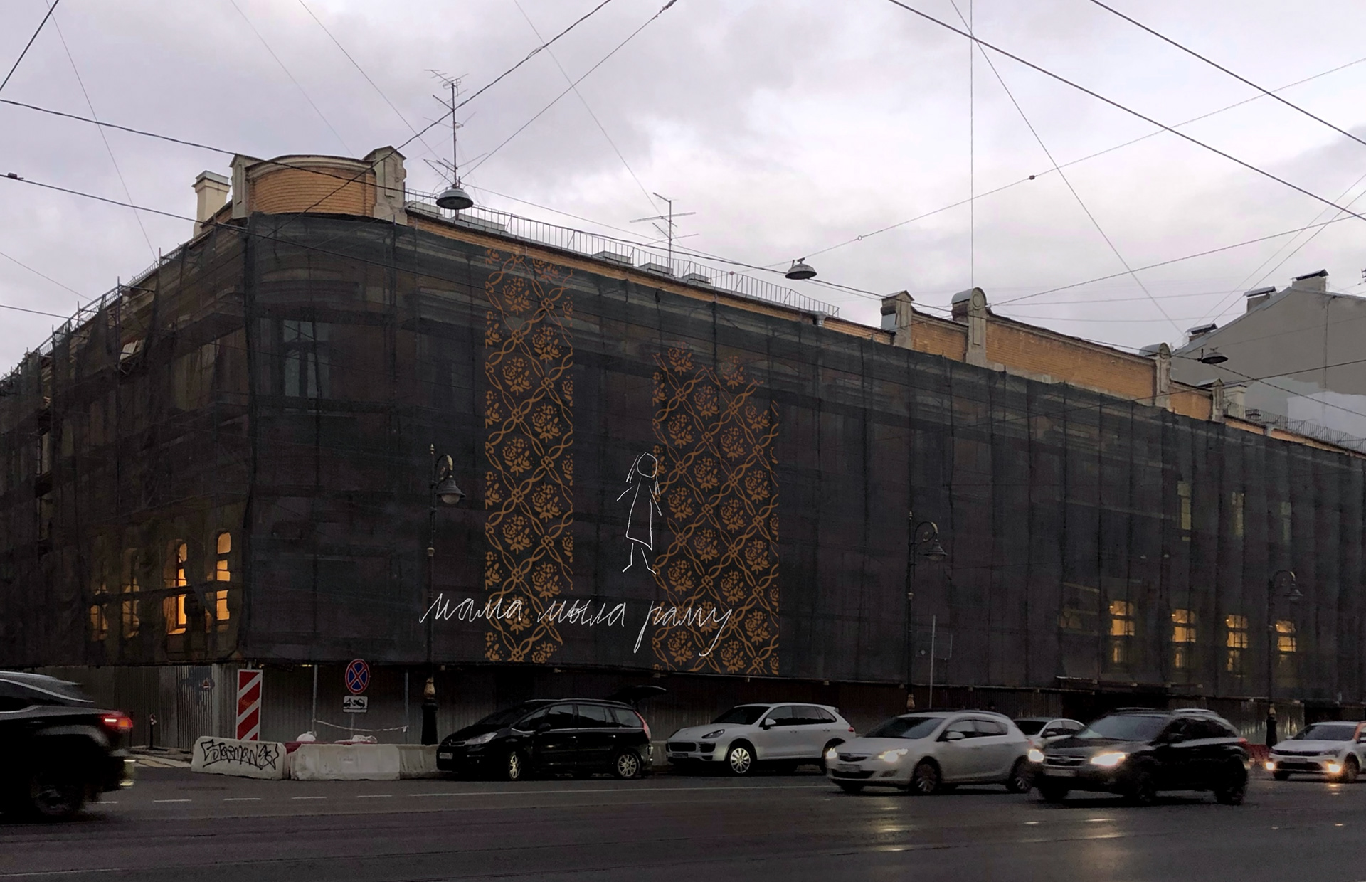 The protective mesh covering the building during renovation became a surface for revealing its past. A pattern of old wallpapers was transferred onto the mesh, bringing the private history of the house and its residents into the public space. This intervention addressed themes of time, memory, and disappearance. The drawing was subtle—visible only to those who came close and paid attention. Like the original wallpapers hidden beneath layers of renovation, the mesh and its image were temporary, disappearing once the reconstruction was complete.