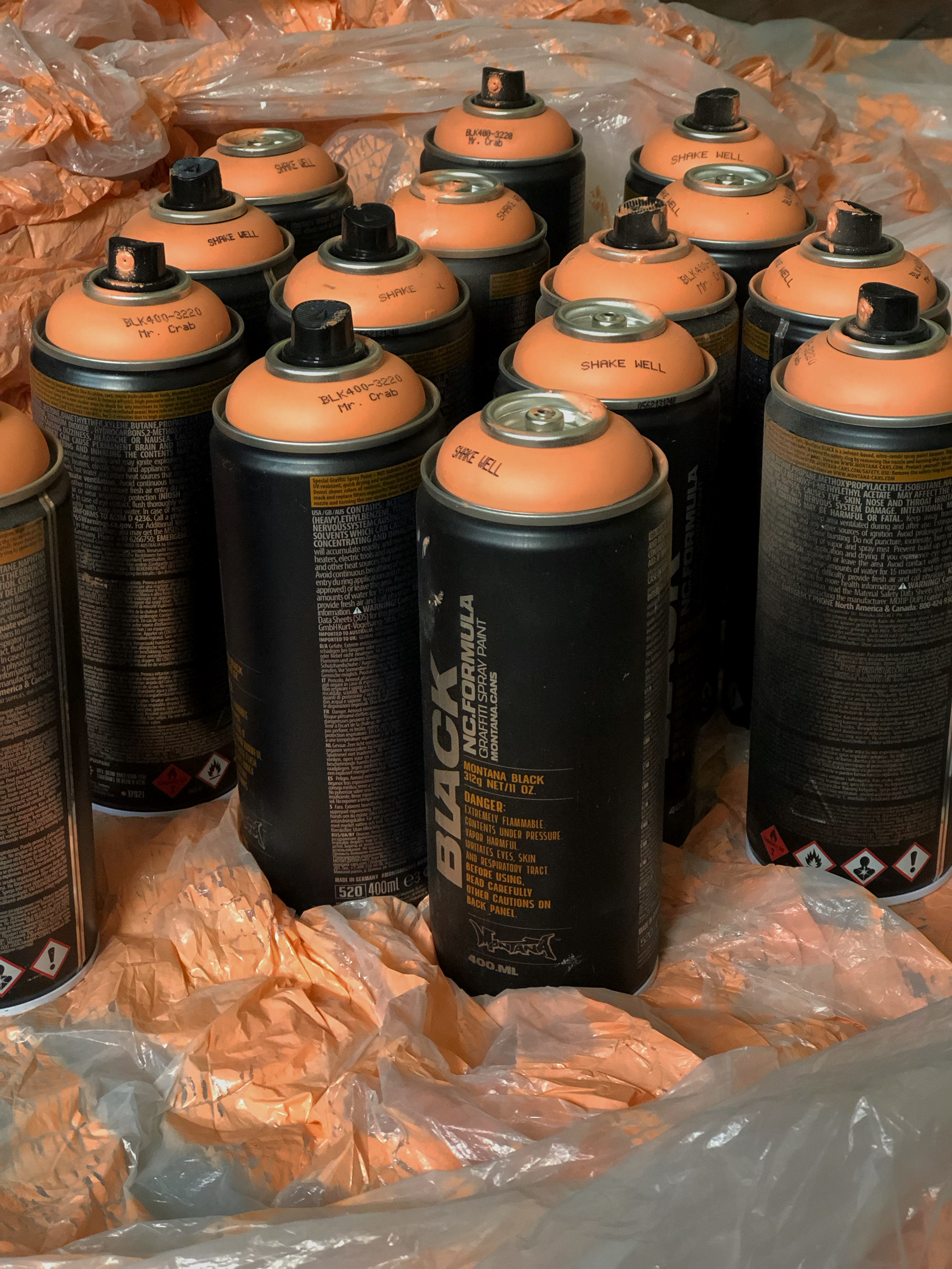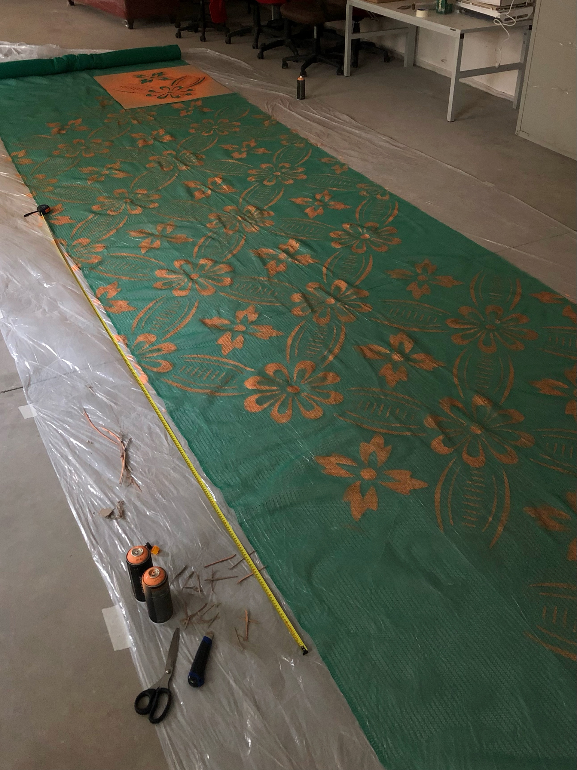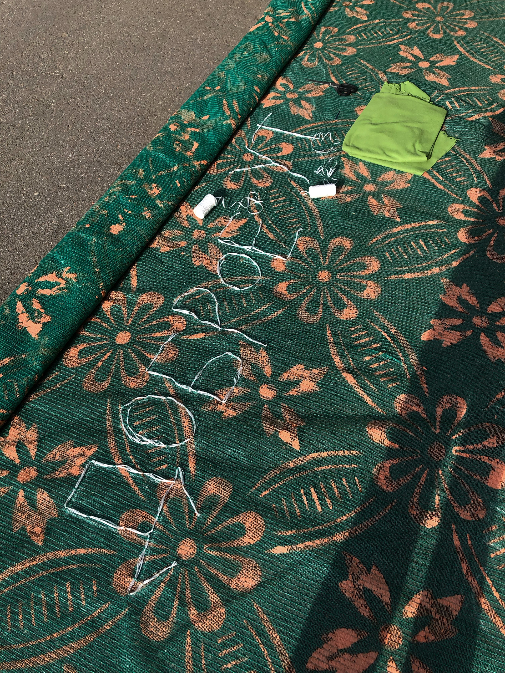 Construction safety mesh, stencil, spray paint, embroidery