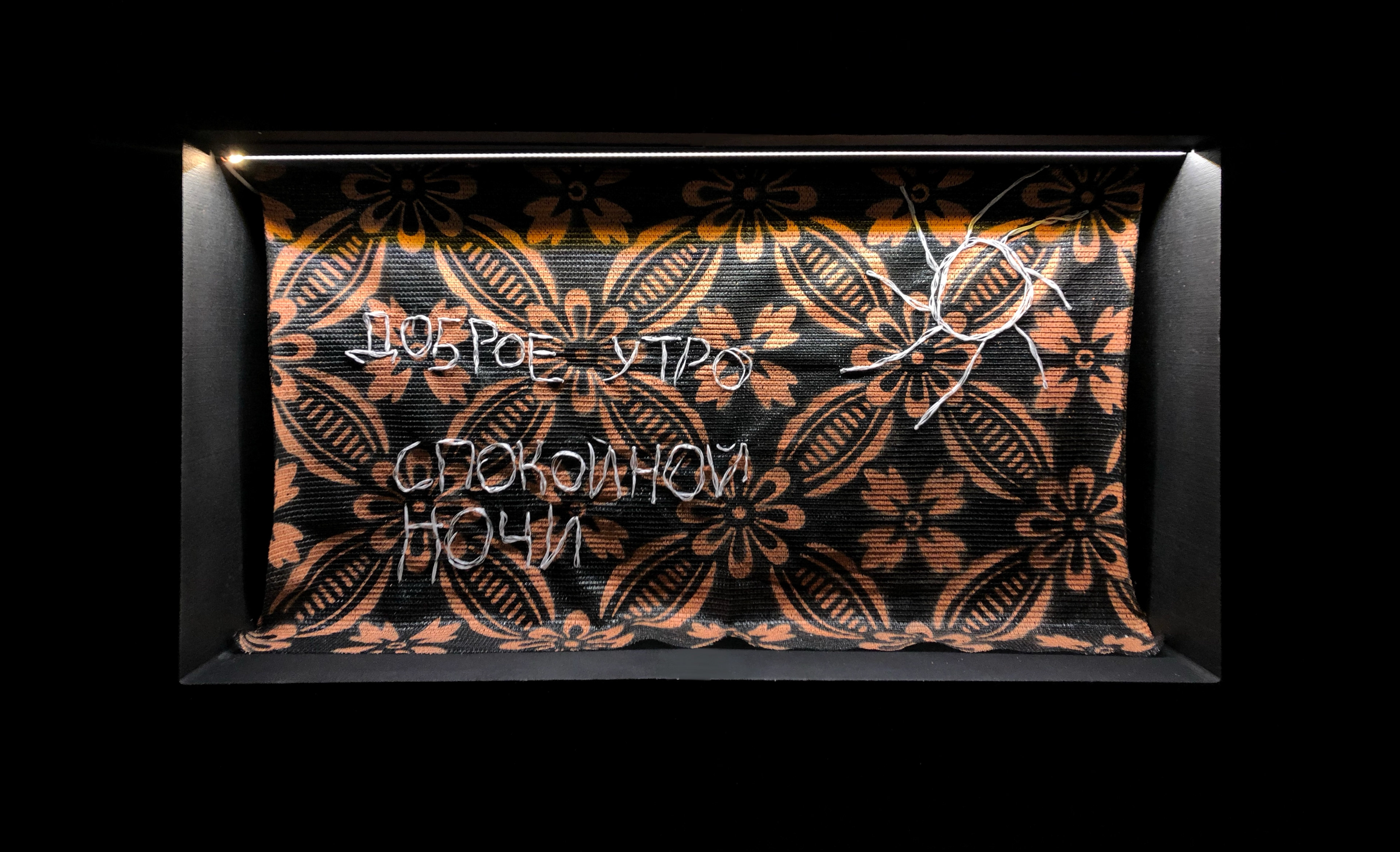 The words embroidered: Good morning, good night.
