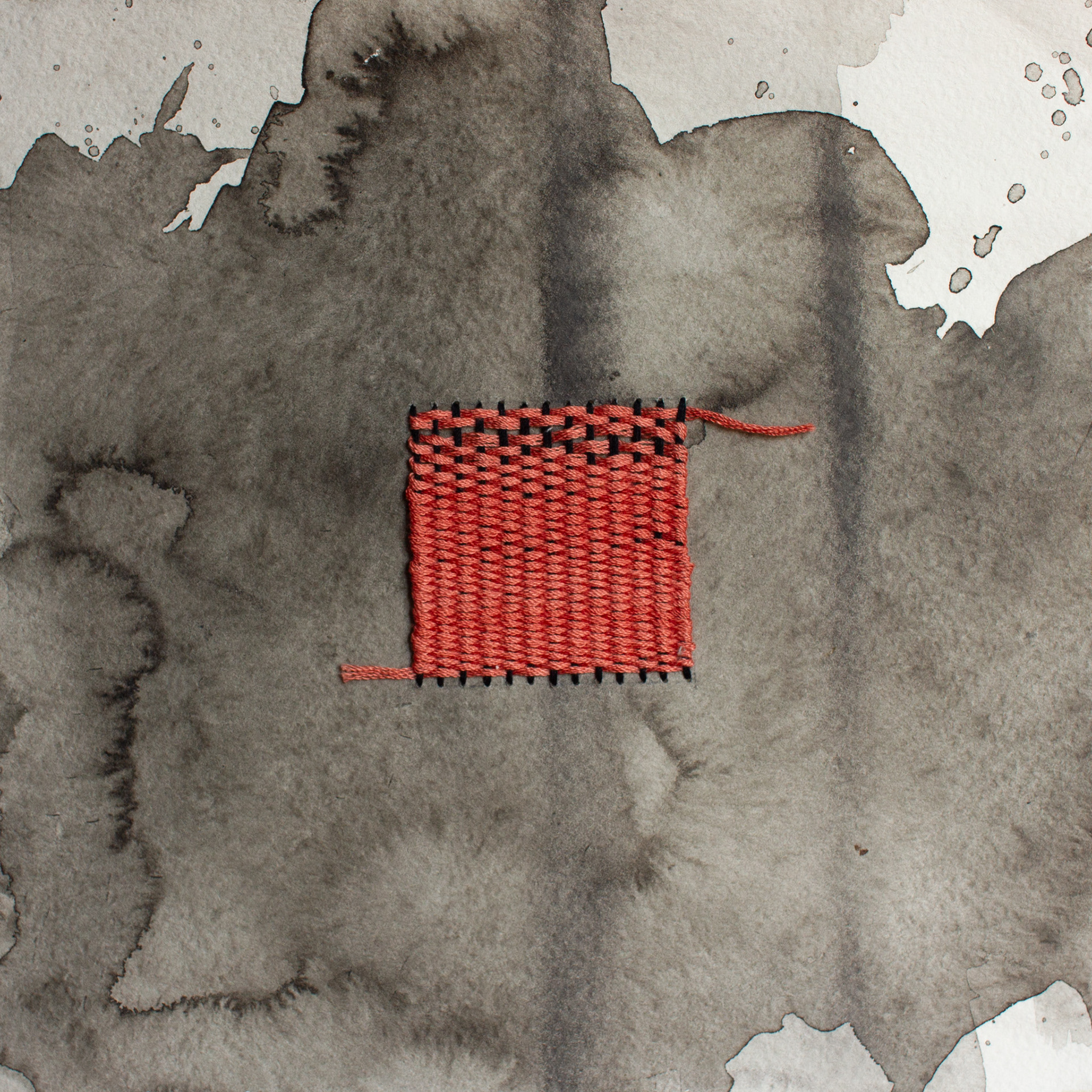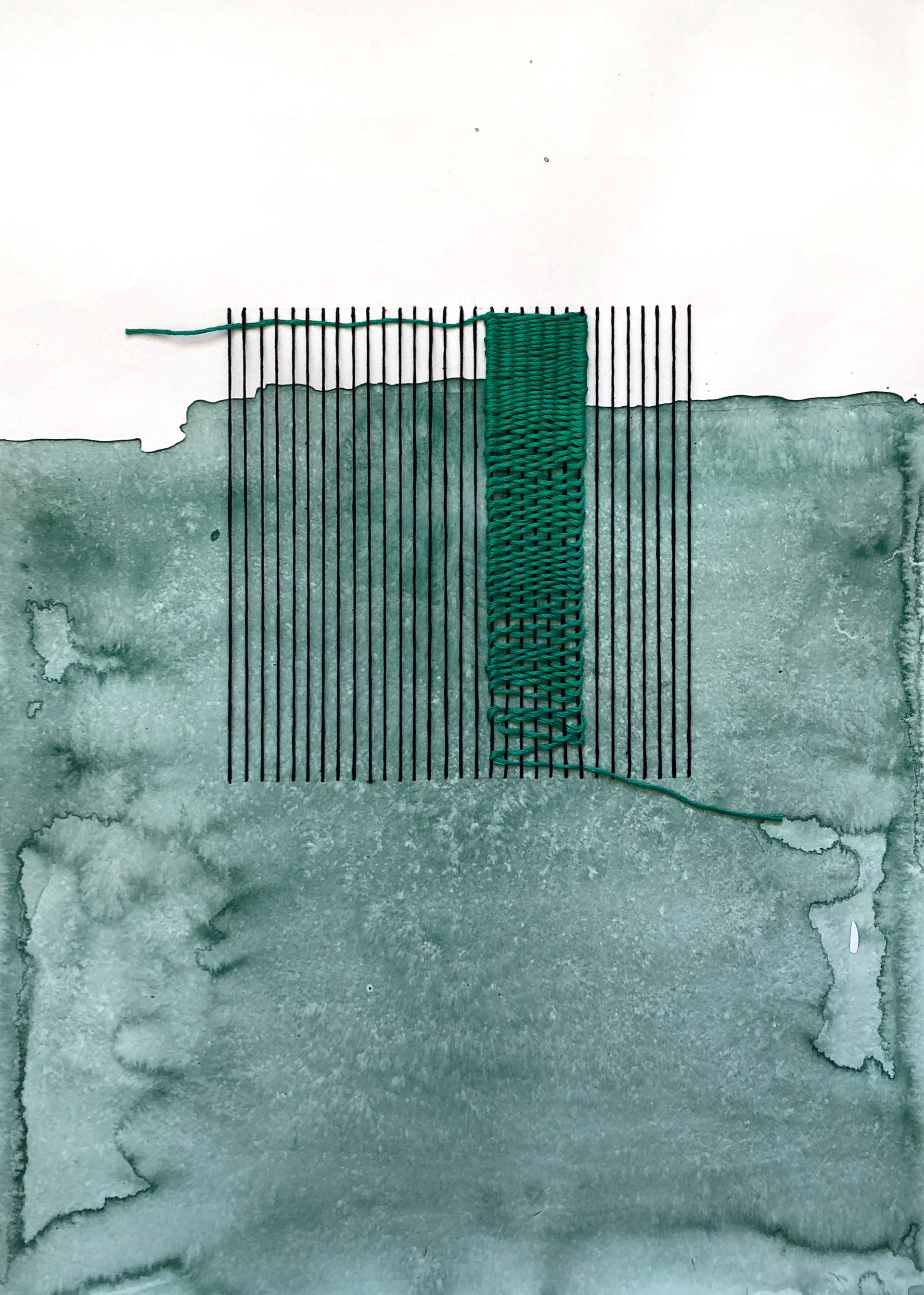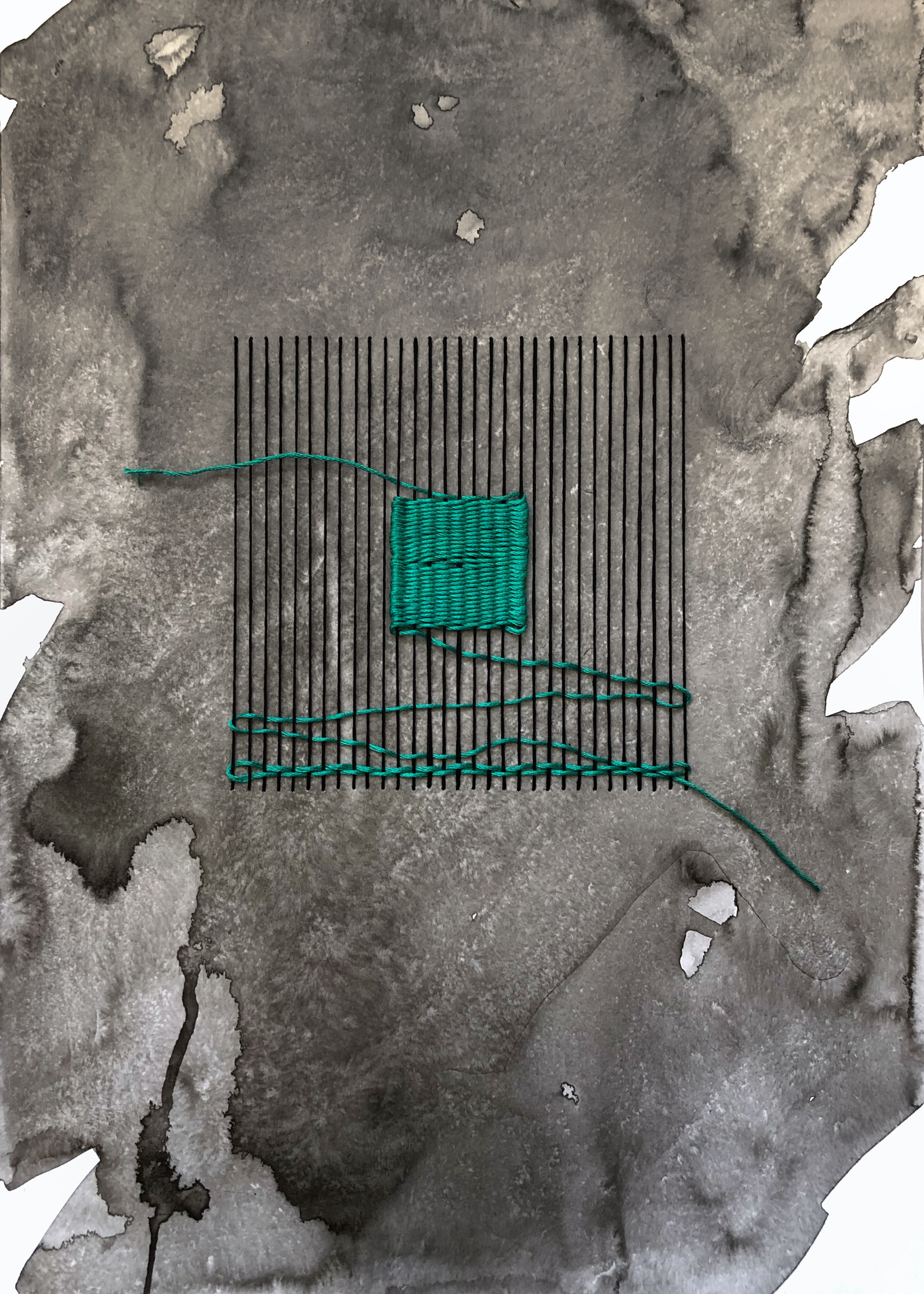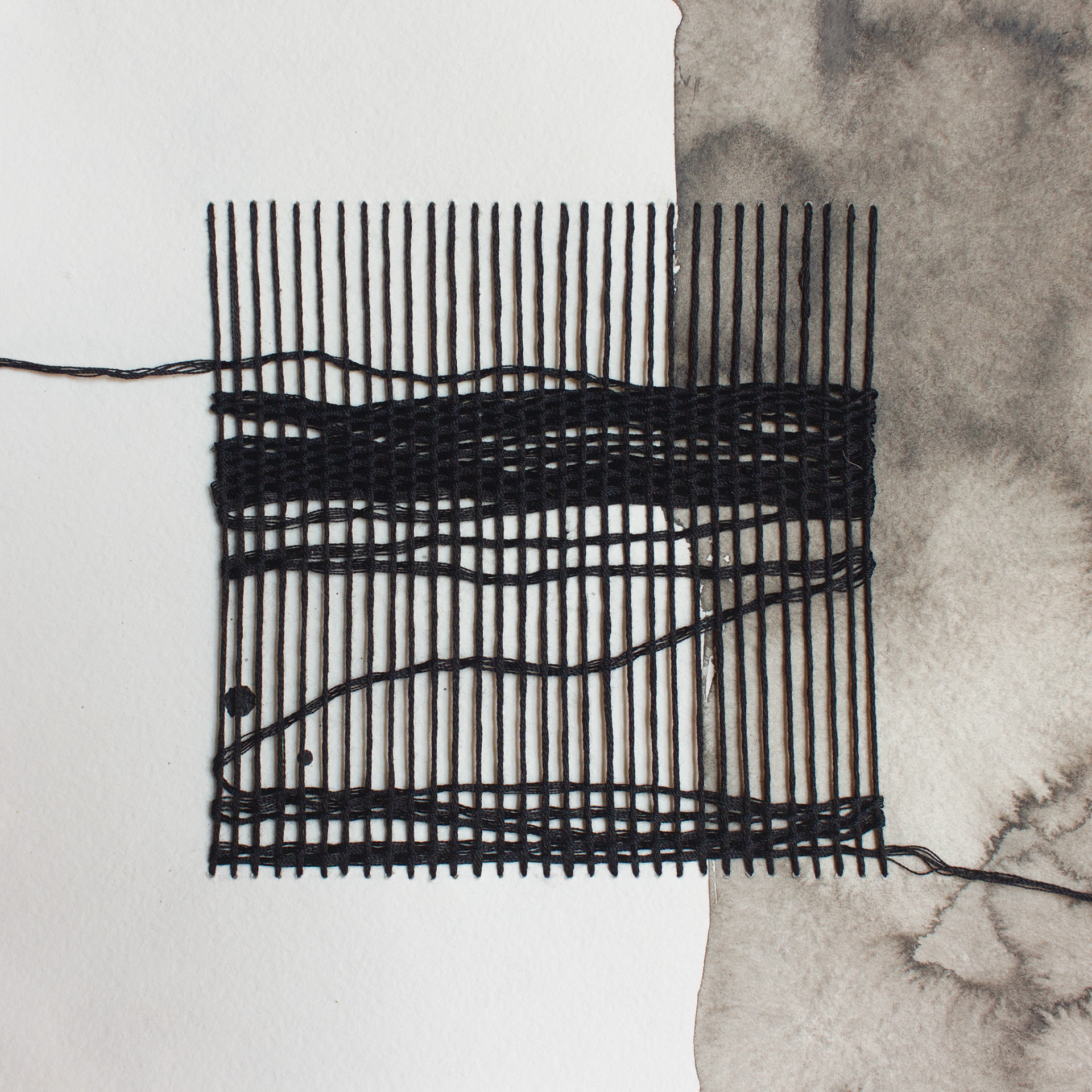 Mixed media, drawing, weaving, ink, cotton threads, paper.