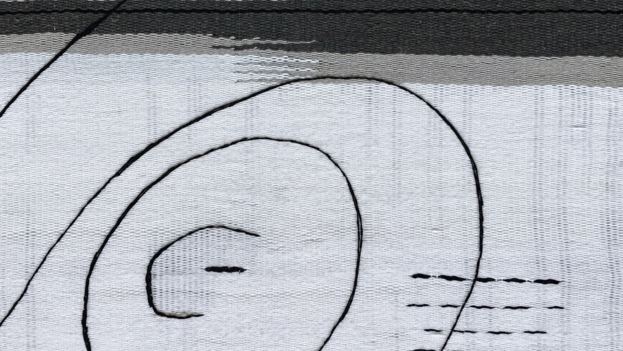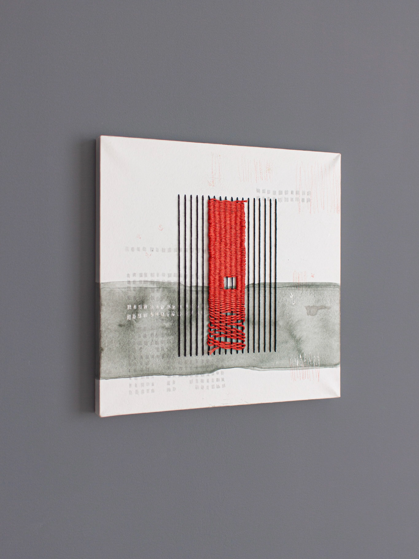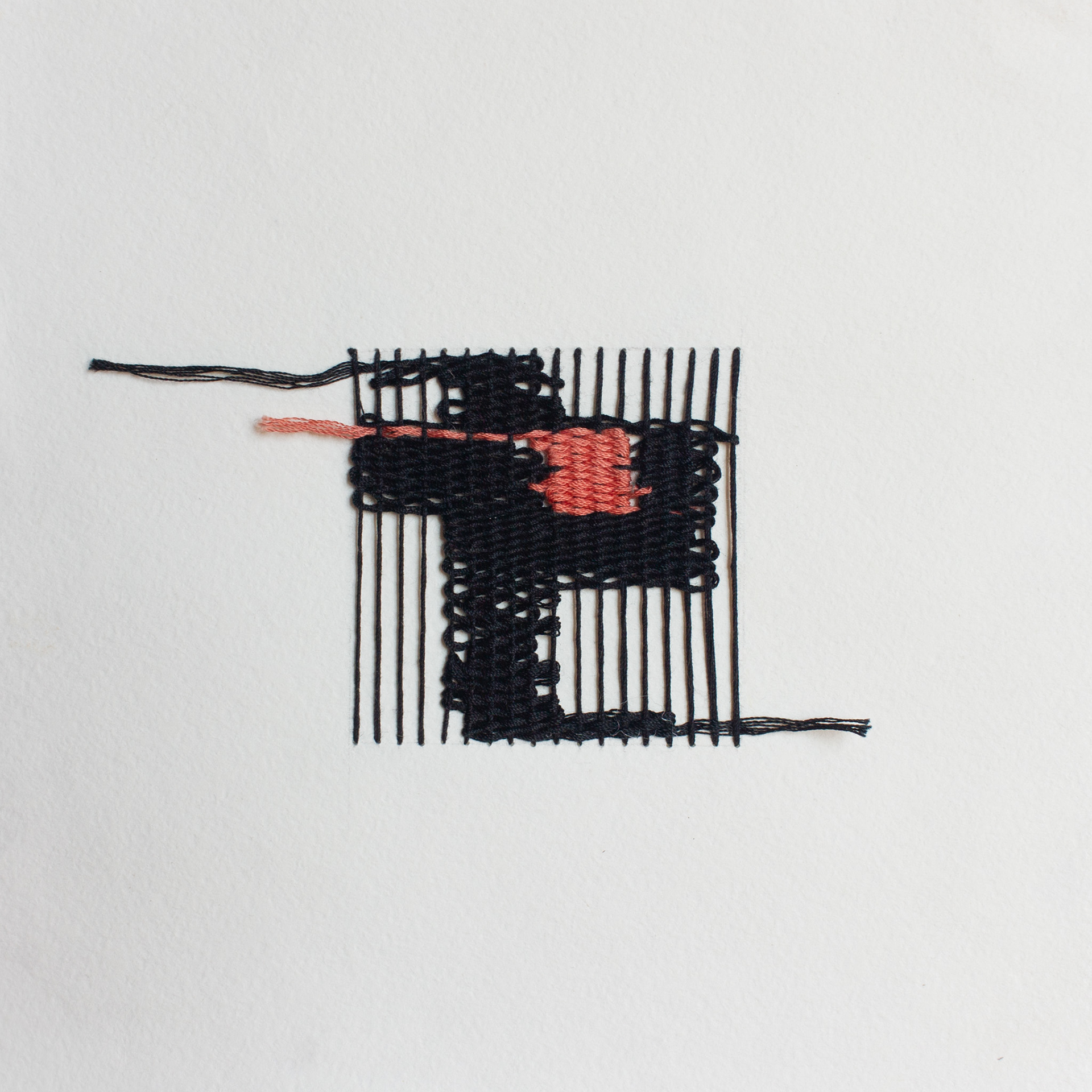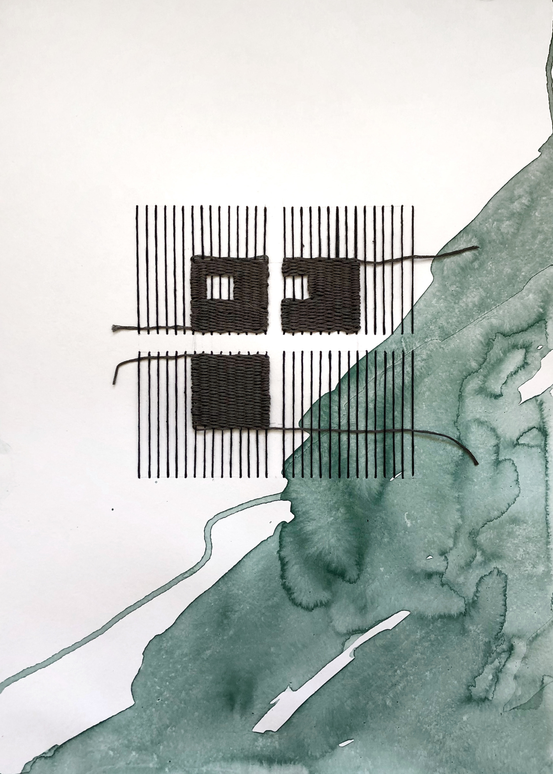 Mixed media, drawing, weaving, ink, cotton threads, paper.